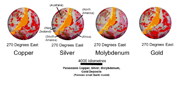“data and settings are essentially the same as those identified within conventional studies. The difference being that, on an increasing radius Earth, prior to the early-Triassic Period, all continental crusts were assembled together on a smaller radius supercontinental Earth. The small Earth assemblages then enable pre-Triassic metallogenic provinces from otherwise remote locations to be assembled together as unique, inter-related provinces on smaller radius Earth models. The assemblage of continents and crustal elements on small Earth models then provides a means to investigate the spatial and temporal distribution of metals across adjoining continents and crustal regimes. Recognition and understanding of past metal distributions on the present-day Earth then potentially enables mineral search and genetic relationships to be extended beyond their known type localities.”
