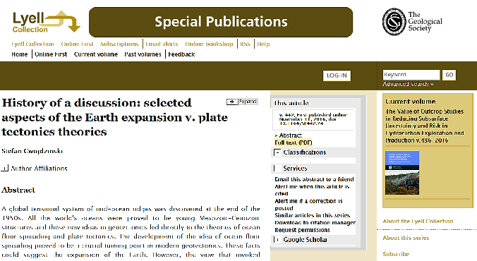 The Geological Society’s Special Publications published a controversial geoscience paper in 2016, History of a discussion: selected aspects of the Earth expansion v. plate tectonics theories, by Stefan Cwojdzinski.