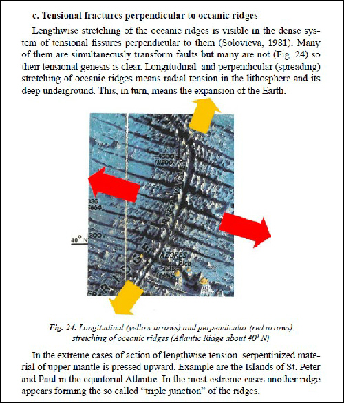 Jan Koziar’s more recent 2018 book, Geological Proofs of Significant Expansion of the Earth, makes the same point, as can be seen on the extract from page 59 shown above. The “Tensional fractures perpendicular to ocean ridges” are described as lengthwise stretching of the ocean ridges. All this means the expansion of the Earth.